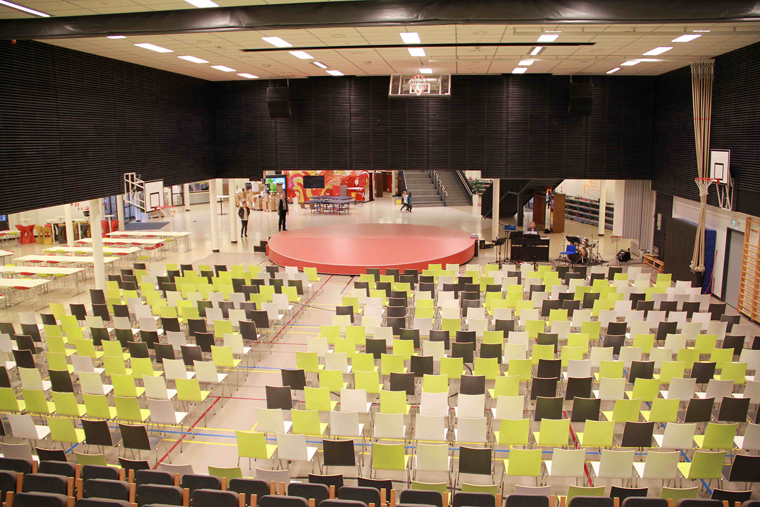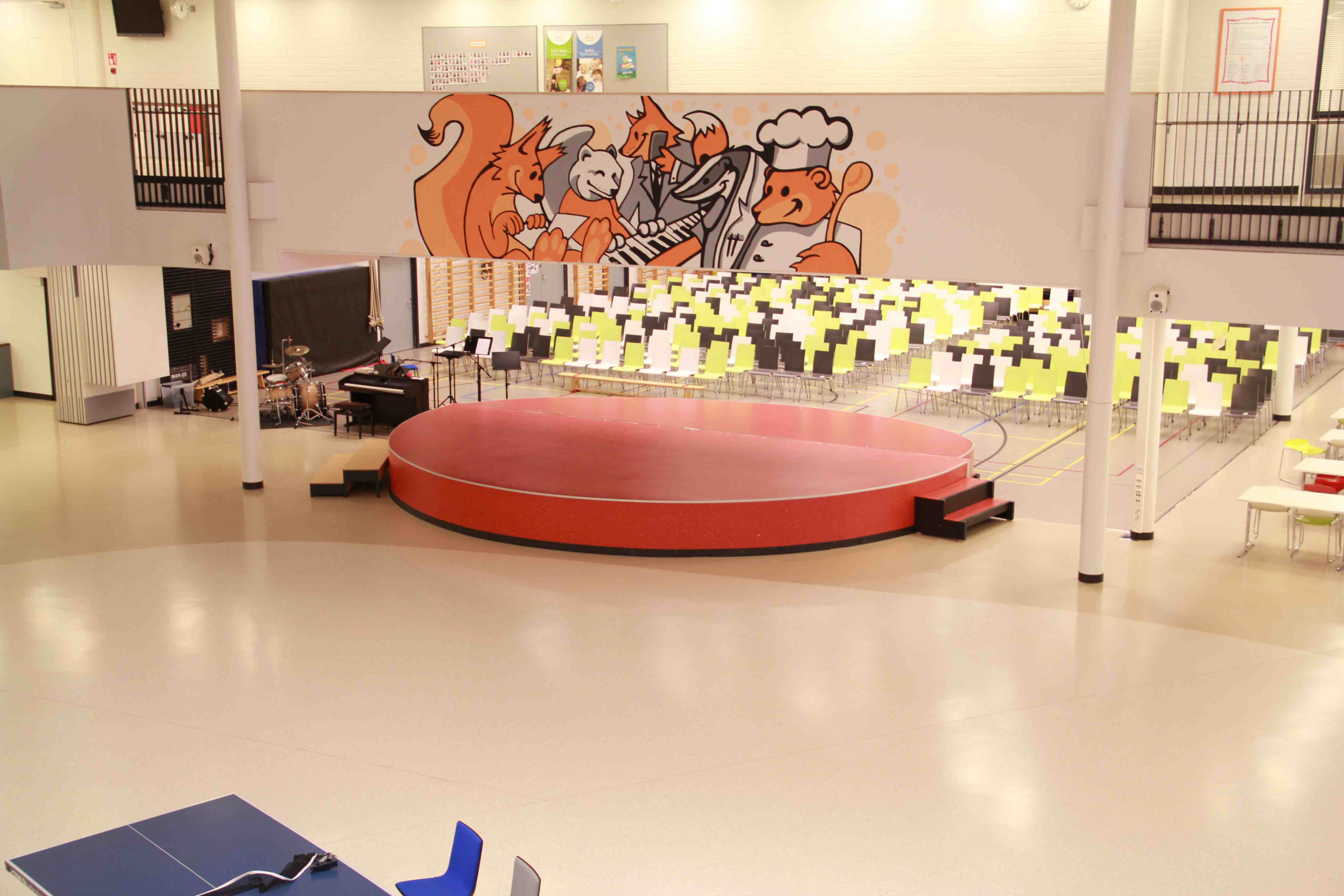 Klassinen ja edustava esimerkki koulusta, jossa tilanjako on hoidettu järkevästi siirtoseiniä apuna käyttäen. Suljettuna siirtoseinät jakavat tilan aulan, ruokalan ja monitoimisalin välillä. Avattuna tilasta saadaan valoisa ja avara. Luokkatiloihin toimitetut siirtoseinät takaavat hyvän äänieristyksen ja työrauhan oppilaille.
